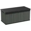The Store-it-Out MAX is the all-purpose outdoor storage box, ideal for garden tools, furniture, and equipment or two 240L wheelie bins. Providing dry storage, piston assisted lid and two wide opening doors for easy access to contents. There are also two lid-lifter chains included to facilitate hands-free opening. Low maintenance and fade-free with heavy duty floor included and lockable feature for added security. Easy to assemble. External Dimensions: W:145.5cm, D:82cm, H125cm.